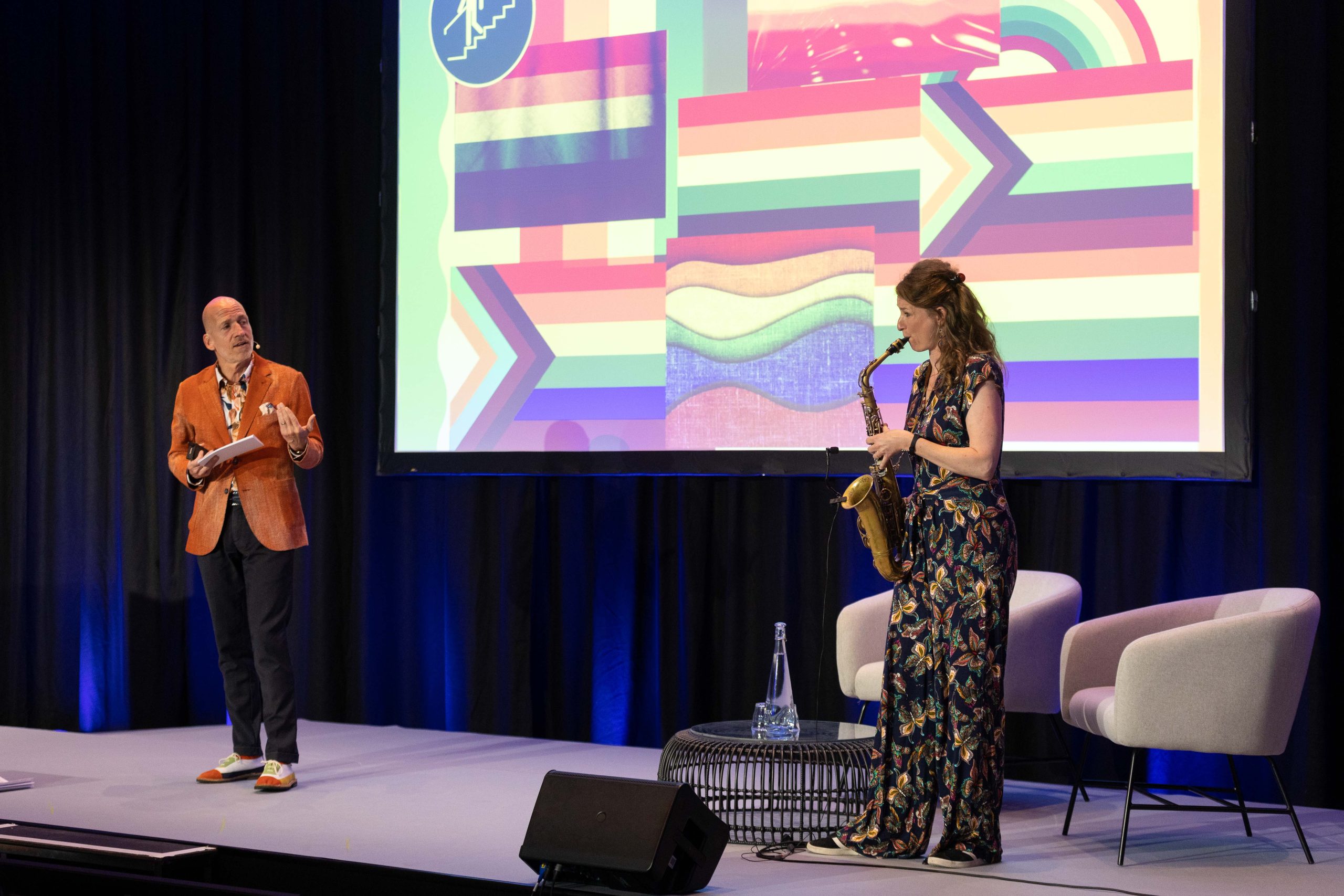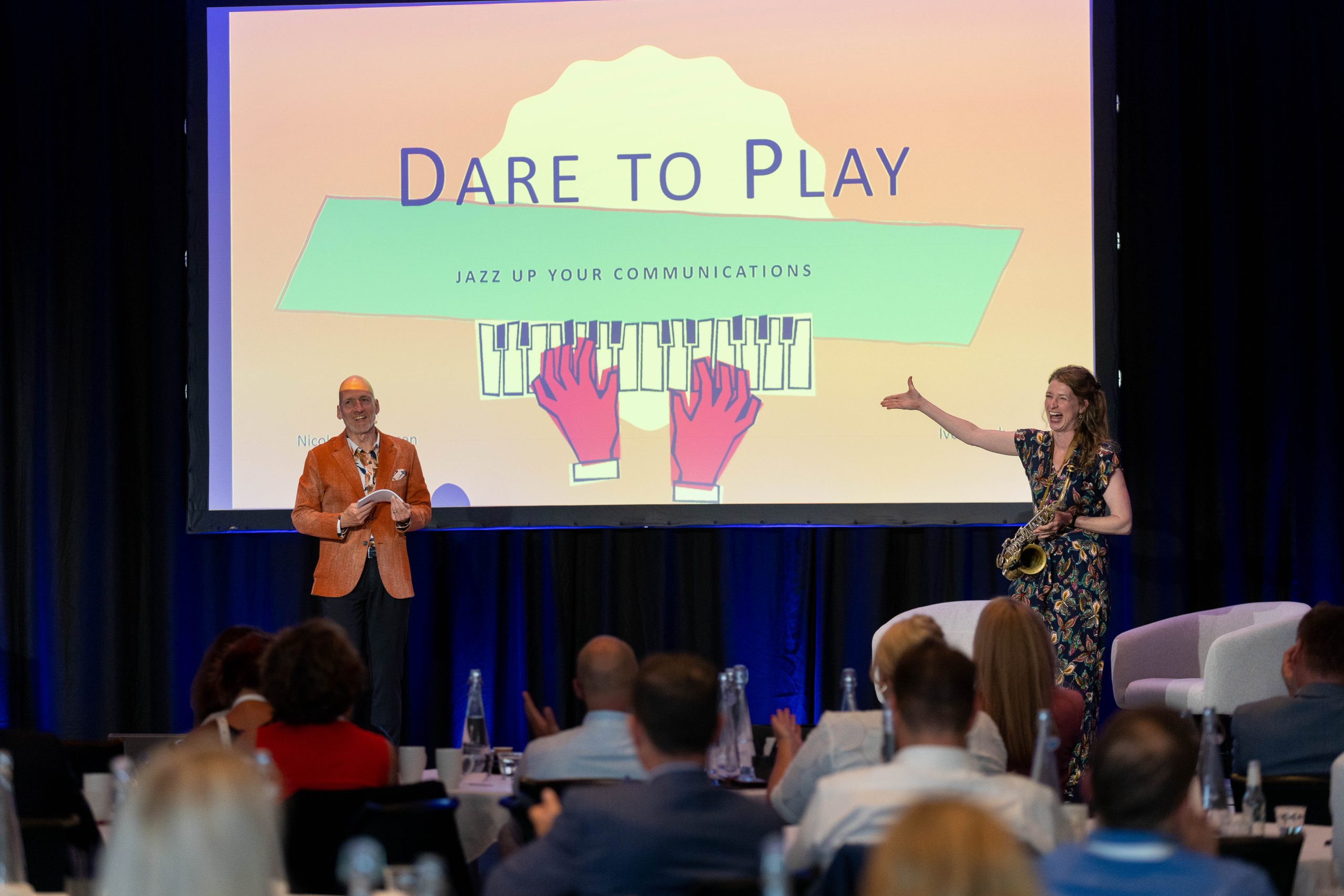 Nicole Johänntgen joins a jam session at the Brussels Jazz Club Sounds, supported by Astrid and Ivo Banek. And, together with Ivo, on the stage of the Communications Summit for the session “Dare to Play – the Art of Improvisation”.